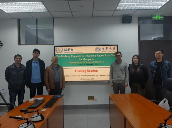 11月10日下午,在MG摆脱游戏国家核应急宣传和培训基地会议室举行了该培训活动的闭幕会。会上,肖德涛教授对此次培训访问活动进行了总结。他指出,为期4周的培训按照日程完成了预定的培训内容,希望此次培训能够使两位学员对氡的特性和测量有进一步的认识,能够为蒙古国关于氡的国家计划起到一定的帮助作用,后续可随时为两位学员提供相应的技术咨询服务。随后,Ganbolor Naranbaatar女士和Bayanjargal Unenbat先生对参与此次培训活动并提供帮助的老师表示了衷心的感谢,在为期4周的培训期间系统性的学习到了氡的相关知识,掌握了相关的实验方法,为帮助蒙古国建立相关的规章制度以及实验能力奠定了良好的理论和技术基础,希望后续MG摆脱游戏能持续为其提供技术支持。