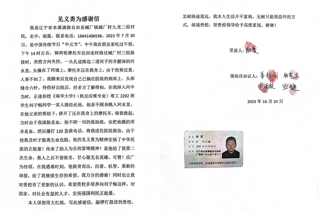 近日,我司收到了一封来自辽宁省本溪满族自治县的感谢信。“他的见义勇为精神宏扬了中华民族的正能量!传承了助人为乐的雷锋精神!是他给了我第二次生命,救人之后不留姓名,甘心做无名英雄。可赞!应广为传颂。在我遇难时刻,他挺身而出,沉着、机智、果断的举措,给了我继续生存的希望。我万分的感谢!同时也让我对贵校有了更新的认识,希望贵校多培养像刘子畅这样,对国家、对社会有益的人才,宏扬强国利民正能量。”信中,这位见义勇为的英雄正是我司核反应堆专业2202班刘子畅同学。