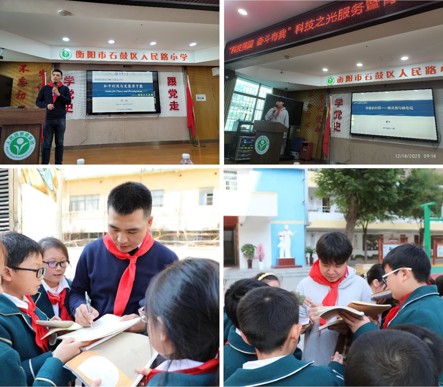 2023年12月14日上午,冯松和杨桧在人民路小学开展了“科技强国奋斗有我”科技之光服务暨青年科学家进校园主题活动,并分别作了题为“和平利用与发展原子能——核技术及应用”和“核能的利用——核武器与核电站”的核科普报告。