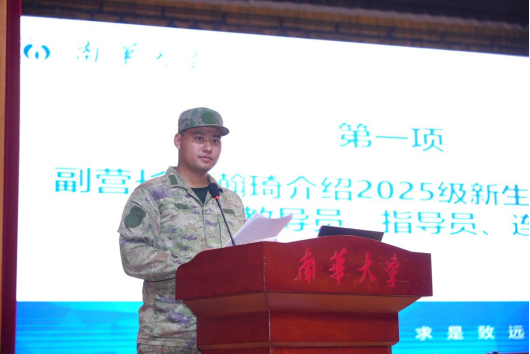 动员大会上,副营长张瀚琦首先介绍了2025级新生军训营的编制安排,并明确提出了“文明带兵、依法带兵、以情带兵”的带兵原则,强调将以科学严谨、关怀互助的方式组织开展本次军训工作。
