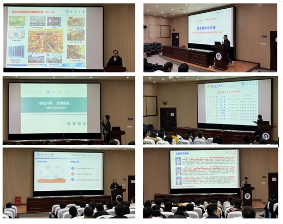 会上,核聚变与等离子体物理团队、中低能物理与强子物理团队、核素提取与分离团队、先进探测器技术团队、反应堆与核动力团队、辐射防护与核安全团队、核分析技术在医学中的应用团队、韦悦周教授团队、刘龙成教授团队、汤贤教授团队分别介绍了各自的研究方向、近5年来取得的科研成果及未来的发展目标和规划等。各报告团队通过详实的数据和生动的案例与同学们展开亲切的交流与互动,结合“强核报国 创新奉献”的新时代核工业精神,导师们鼓励同学们积极加入到核学科的研究建设当中,不断提升科研能力和创新创业能力,为学校团队建设贡献力量。